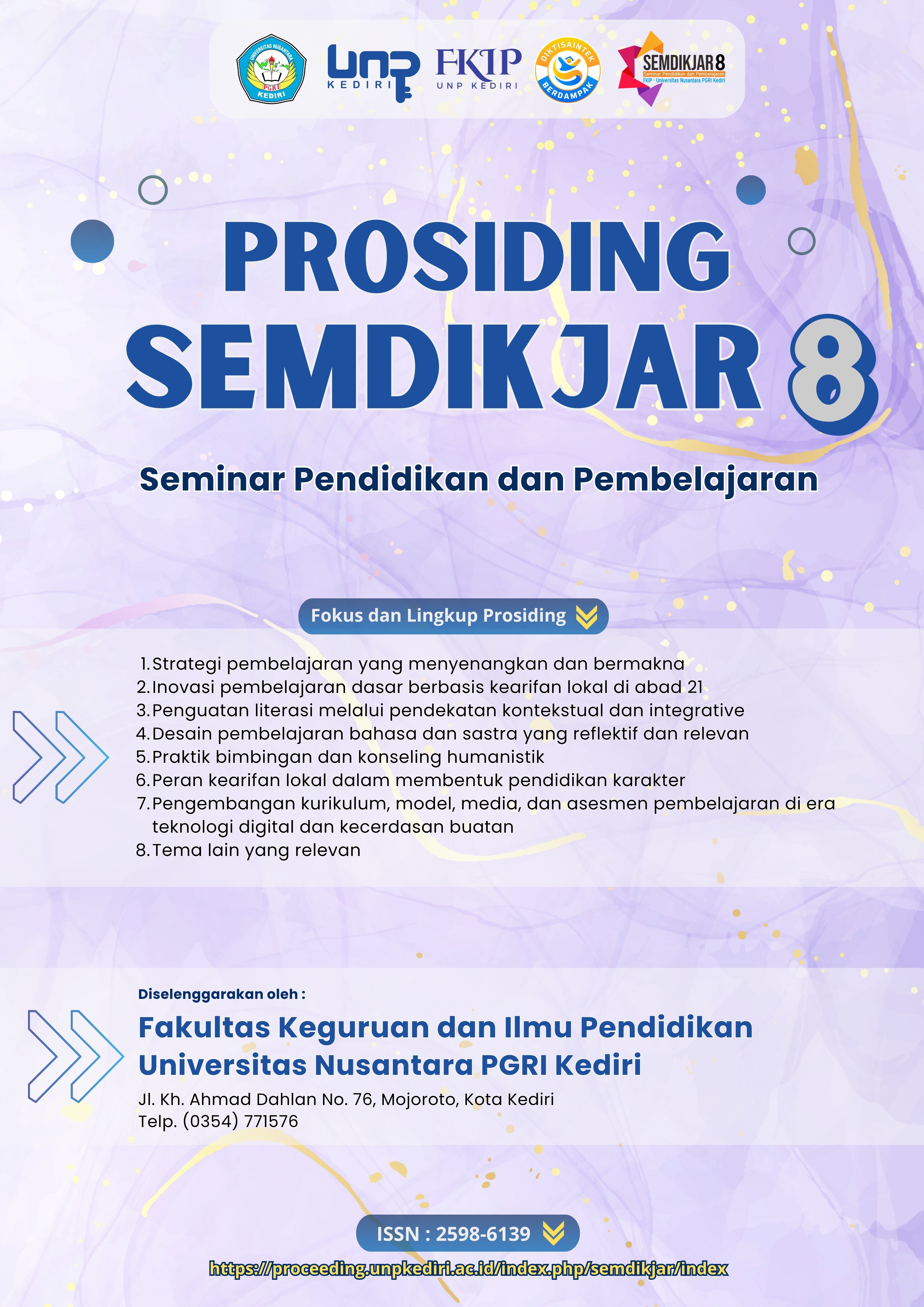 Prosiding SEMDIKJAR (Seminar Pendidikan dan Pembelajaran) ini merupakan kumpulan artikel yang dipresentasikan pada Seminar Pendidikan dan Pembelajaran (SEMDIKJAR) level Nasional. Artikel yang dipublikasikan ini merupakan artikel ilmiah yang merupakan hasil penelitian, pengabdian kepada masyarakat, dan kajian konseptual oleh para author dari berbagai penjuru Nusantara. Prosiding ini telah terdaftar pada LIPI dengan ISSN: 2598-6139 sejak tahun 2017. Sampai sekarang ini SEMDIKJAR telah dilaksanakan 8 kali. Pada Edisi delapan ini mengambil tema "Deep Learning berbasis Kearifan Lokal: Mewujudkan Pendidikan Berdampak yang Humanis dan Visioner".